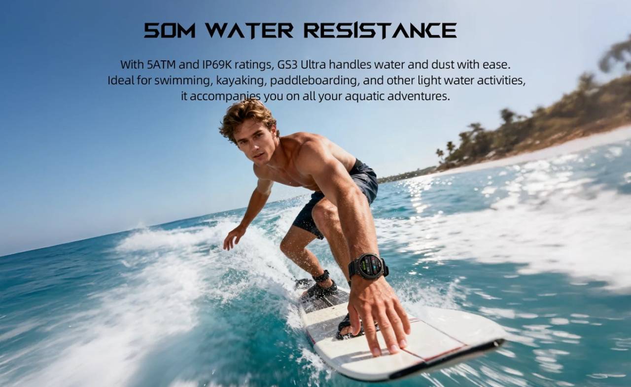 به عنوان یک ساعت هوشمند مقاوم، انتظار میرود که بلک شارک GS3 اولترا در برابر شرایط سخت محیطی تاب بیاورد. این گجت موفق به دریافت گواهینامه نظامی MIL-STD-810 شده است که تضمین کننده عملکرد آن در شرایط دشوار فیزیکی است. علاوه بر مقاومت در برابر نفوذ آب تا فشار 5ATM (مناسب برای شنا)، این ساعت دارای استاندارد IP69K نیز میباشد.