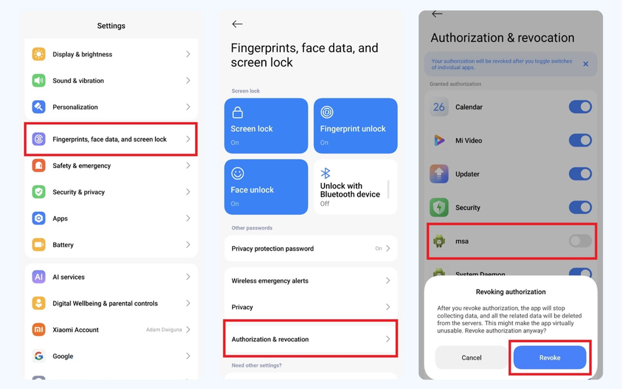 4. کلید MSA را خاموش کرده و روی Revoke بزنید تا تأیید شود.
