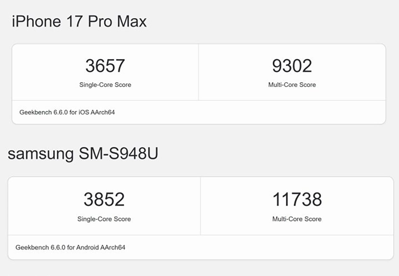 نکته هیجانانگیز این گزارش، فراتر از اعداد خام، فاصله ایجاد شده بین این گوشی و رقیب اصلیاش است. اگر این نتایج را با امتیازهای اولیه نسبت داده شده به آیفون 17 پرو مکس (iPhone 17 Pro Max) که از تراشه «A19 Pro» استفاده میکند مقایسه کنیم، متوجه برتری محسوس سامسونگ میشویم. طبق شایعات و دادههای فاش شده، امتیاز آیفون جدید اپل در بخش چندهستهای در محدوده 9000 قرار دارد، در حالی که گلکسی S26 اولترا به مرز 11700 رسیده است. این یعنی پرچمدار سامسونگ در پردازشهای سنگین حدود 19 تا 20 درصد سریعتر از قدرتمندترین آیفون امسال عمل میکند.