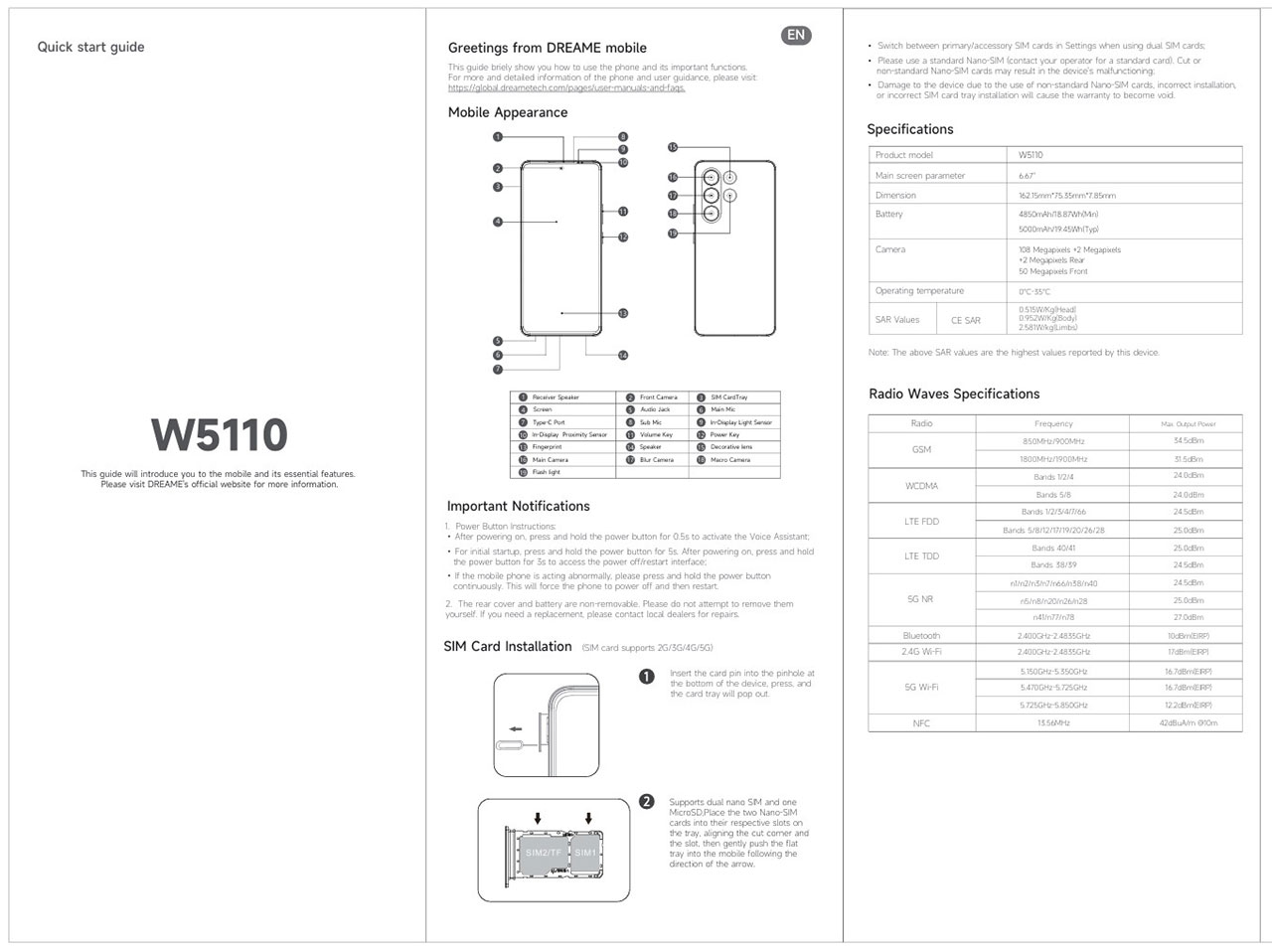 اطلاعات فاش شده از دو منبع کلیدی به دست آمدهاند. اولین گوشی دریم با شماره مدل W5110 در پایگاه داده EPREL مشاهده شده است. EPREL (مخفف European Product Registry for Energy Labelling) یک پایگاه داده اروپایی برای ثبت برچسبهای انرژی محصولات است و حضور یک دستگاه در آن نشان میدهد که سازنده در حال آماده شدن برای عرضه آن در بازار اروپا است. علاوه بر این، دفترچه راهنمای کاربر این دستگاه نیز به صورت آنلاین پیدا شده که جزئیات بیشتری از مشخصات و حتی طراحی آن را آشکار میکند.