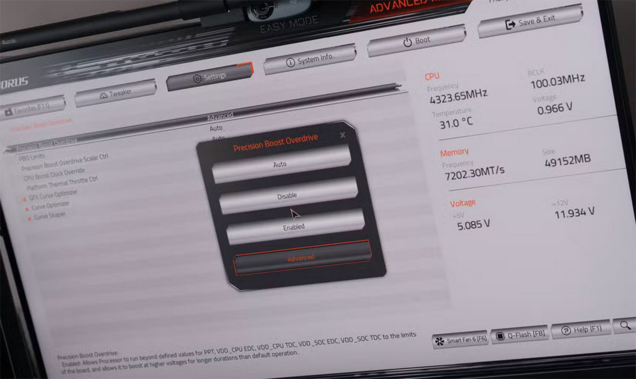 اگر سیستم شما از خنک کنندگی کافی برخوردار است، دو تنظیم دیگر در بایوس وجود دارند که میتوانند عملکرد پردازنده شما را به سطح بالاتری برسانند: Precision Boost Overdrive (به اختصار PBO) برای پردازندههای AMD و Multi-Core Enhancement (به اختصار MCE) برای پردازندههای اینتل. این گزینهها که در حوزه بهبود تنظیمات بایوس برای بازی قرار میگیرند، به پردازنده شما اجازه میدهند تا برای مدت طولانیتری به فرکانسهای بوست (Boost) بالاتر دست یابد.