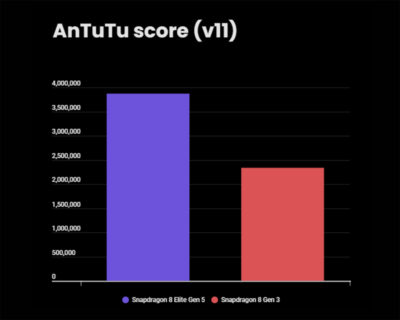 در پلتفرم AnTuTu 11، شیائومی 17 (مجهز به اسنپدراگون 8 الیت نسل 5) تقریباً به مرز امتیاز 4 میلیون میرسد. برخی از دستگاههای پرچمدار دیگر مانند آنر مجیک 8 و ویوو X300 پرو حتی از این مرز نیز عبور کردهاند. در سوی دیگر، اسنپدراگون 8 نسل 3 امتیازی در حدود 2.3 میلیون کسب میکند. این یعنی شاهد یک افزایش قاطع 66 درصدی در امتیاز کلی AnTuTu برای اسنپدراگون 8 الیت نسل 5 هستیم.
