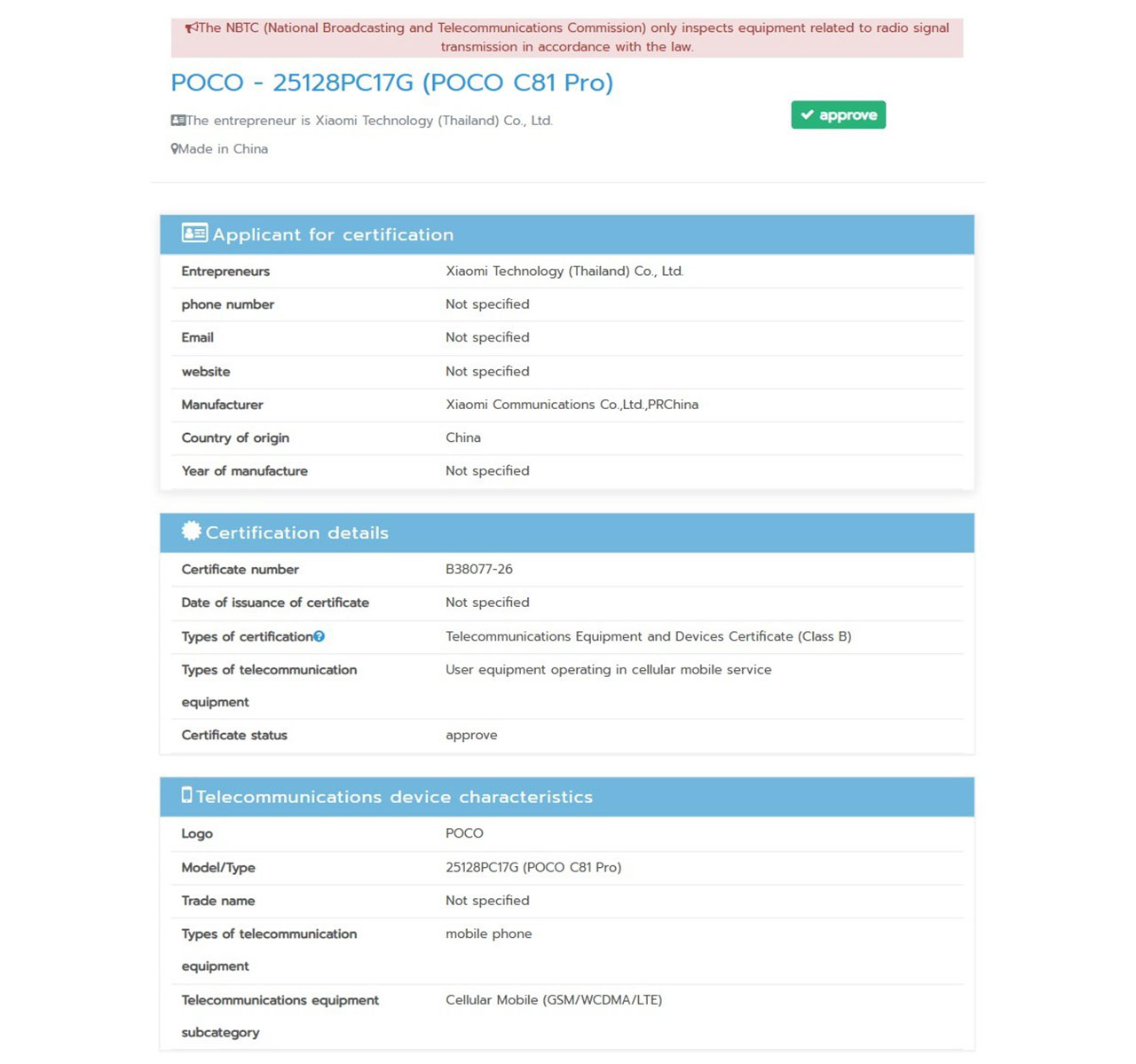 به نظر میرسد برند پوکو (Poco)، زیرمجموعه محبوب شیائومی، در حال آمادهسازی یک گوشی هوشمند اقتصادی جدید با نام پوکو C81 پرو است. این خبر به دنبال ثبت یک دستگاه جدید از این شرکت در پایگاه داده سازمان تنظیم مقررات تایلند (NBTC) منتشر شد که نشان میدهد این گوشی مراحل قانونی برای عرضه در بازارهای جهانی را طی میکند و به زودی شاهد رونمایی رسمی آن خواهیم بود.