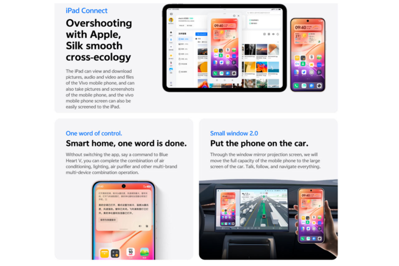 این یکپارچگی به دنیای اپل نیز گسترش یافته است. کاربران آیپد اکنون میتوانند فایلهای صوتی، تصویری و اسناد موجود در گوشی ویوو خود را مشاهده و دانلود کنند و حتی صفحه گوشی ویوو خود را روی آیپد به نمایش بگذارند. کنترل خانههای هوشمند نیز سادهتر از همیشه شده است؛ میتوانید با صدور فرمانهای صوتی به Xiao V، چندین دستگاه هوشمند مانند تهویه مطبوع یا تصفیه کننده هوا را کنترل کنید. در نهایت، قابلیت Mirror Window 2.0 به شما اجازه میدهد تا تمام قابلیتهای گوشی خود، از چت کردن و تماشای سریال گرفته تا مسیریابی را به صورت کامل روی صفحه نمایش خودروی خود داشته باشید.